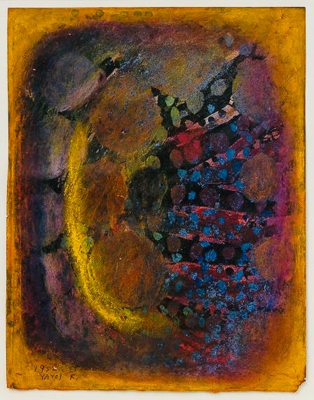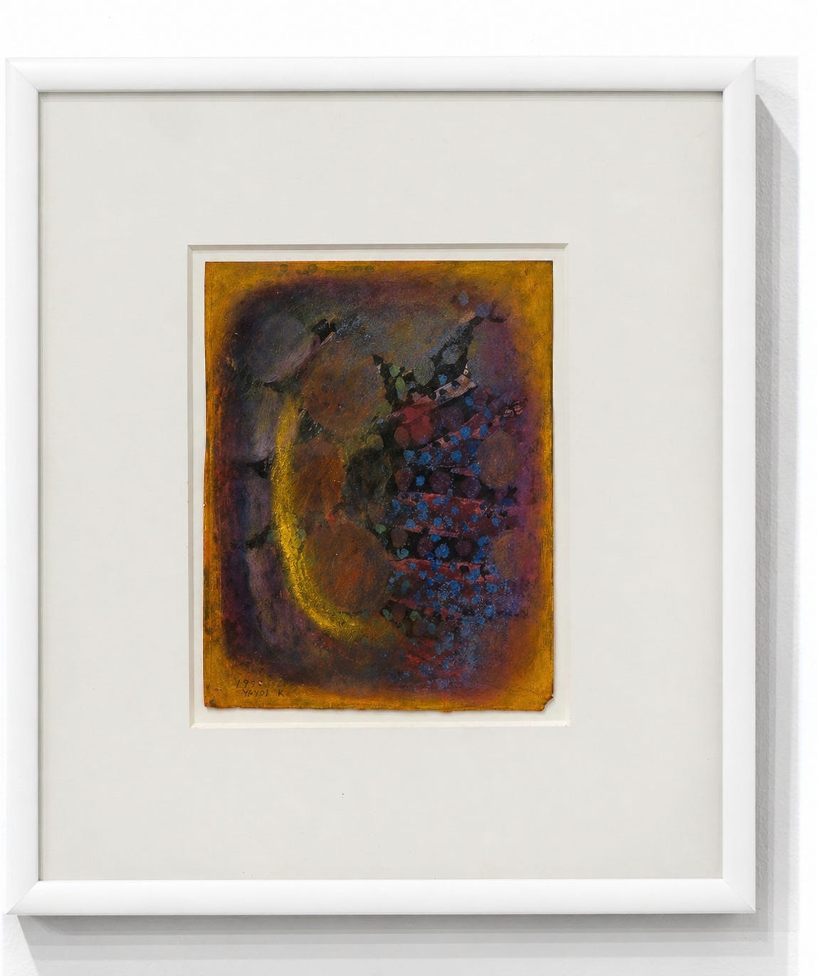 A Flower (Fig. 4) emerges from this early period, before Kusama left Japan for the United States in 1957. Although the title suggests a natural subject, the painting resists straightforward representation. Instead of a botanical image, Kusama presents a dense, pulsating field of color and texture. Biomorphic shapes hover between recognition and dissolution, while clustered, cell-like formations begin to accumulate across the surface. A glowing, almost radiant arc of yellow cuts through darker tones, suggesting not light in a conventional sense but an internal energy or aura. The composition feels less like an observed object and more like an internal vision, an attempt to render perception itself.