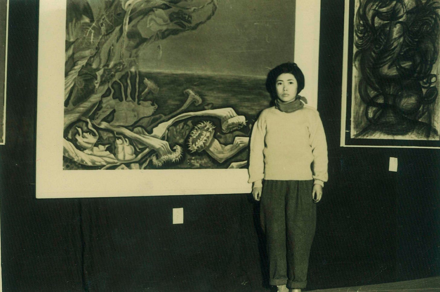 Born in 1929 in Matsumoto, Japan, Kusama grew up in a very conservative household where her early desire to become an artist was not encouraged. From childhood, she experienced vivid hallucinations: fields of dots, engulfing patterns, and proliferating forms that would later become the foundation of her work. She studied traditional Japanese painting, but quickly rejected its constraints, gravitating instead toward a more experimental, psychologically driven form of expression. By early 1950s, she was producing works on paper that explored organic forms, abstraction, and repetition. These works culminated in her first solo exhibition in 1952 (Fig. 3), the same year A Flower was created and possibly part of the show.